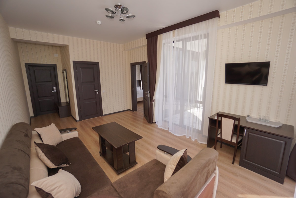 Двухкомнатный номер с большой двуспальной кроватью. Дополнительное размещение на двухместном диване.